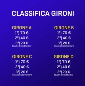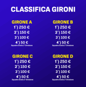 Le 272 squadre partecipanti verranno suddivise in 4 gironi da 68 squadre. Il criterio “Somma Punti” verrà utilizzato per stabilire la classifica dei gironi, tale classifica determinerà:- i vincitori dei premi riservati ai gironi