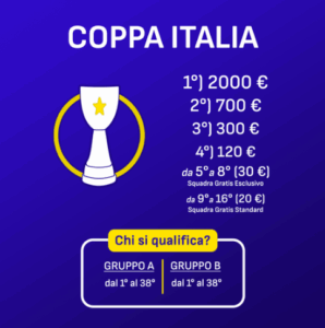 A partire dalla 3ª giornata di Serie A avrà inizio la Coppa Italia, alla quale parteciperanno tutte le 272 squadre del fantacalcio Esclusivo. Le squadre saranno suddivise in 2 gruppi da 136 e si sfideranno in scontri diretti casuali. Ogni vittoria assegnerà 3 punti, ogni pareggio 1 punto, ogni sconfitta 0 punti. La somma dei punti determinerà la classifica.