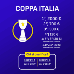 A partire dalla 3ª giornata di Serie A avrà inizio la Coppa Italia, alla quale parteciperanno tutte le 352 squadre del fantacalcio Standard. Le squadre saranno suddivise in 2 gruppi da 176 e si sfideranno in scontri diretti casuali. Ogni vittoria assegnerà 3 punti, ogni pareggio 1 punto, ogni sconfitta 0 punti. La somma dei punti determinerà la classifica. Al termine dei PlayOff, le prime 38 squadre di ciascun gruppo accederanno alla Fase Finale.- PlayOff Giornata di Inizio: 3ª di Serie A Giornata di Fine: 22ª di Serie A